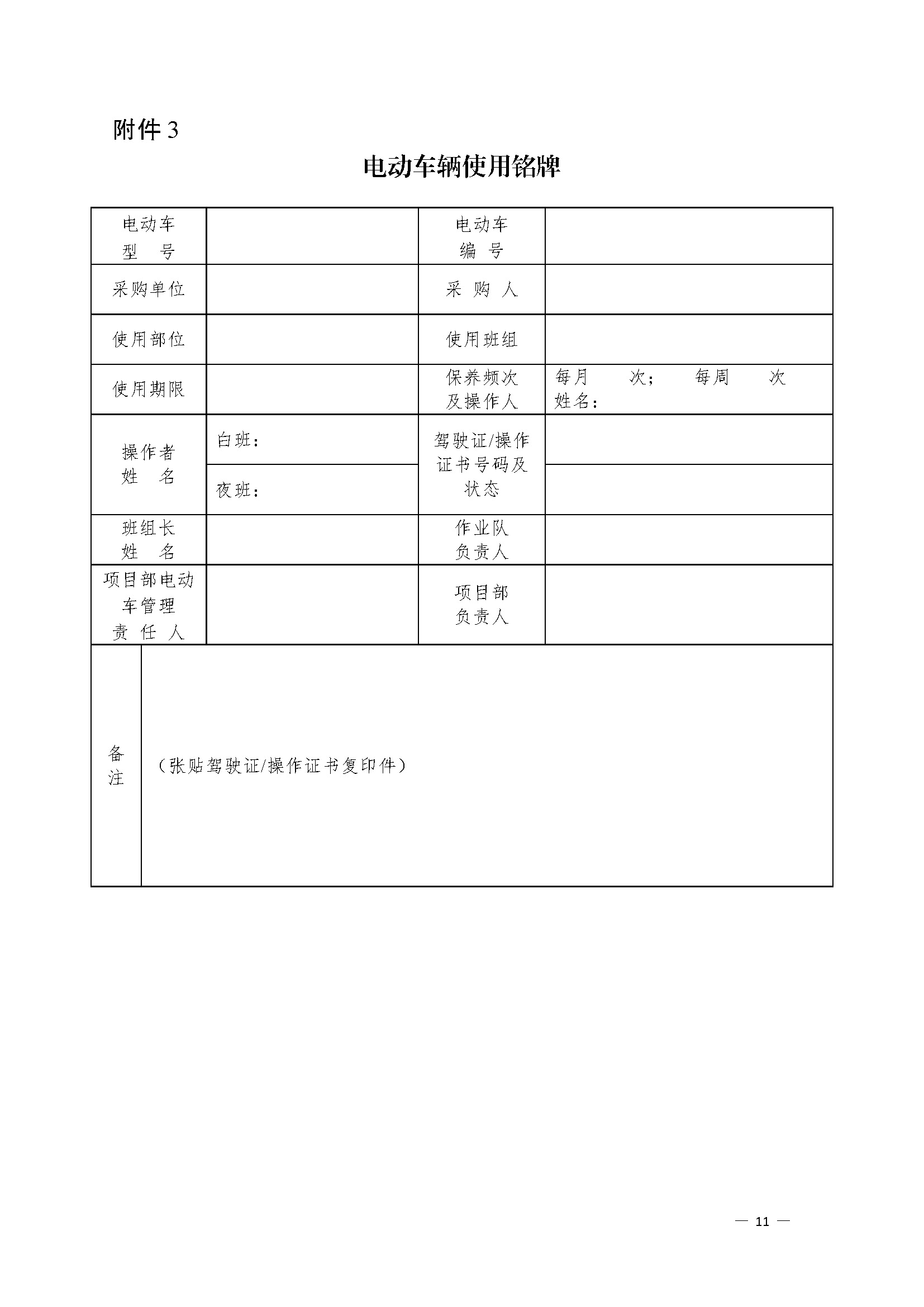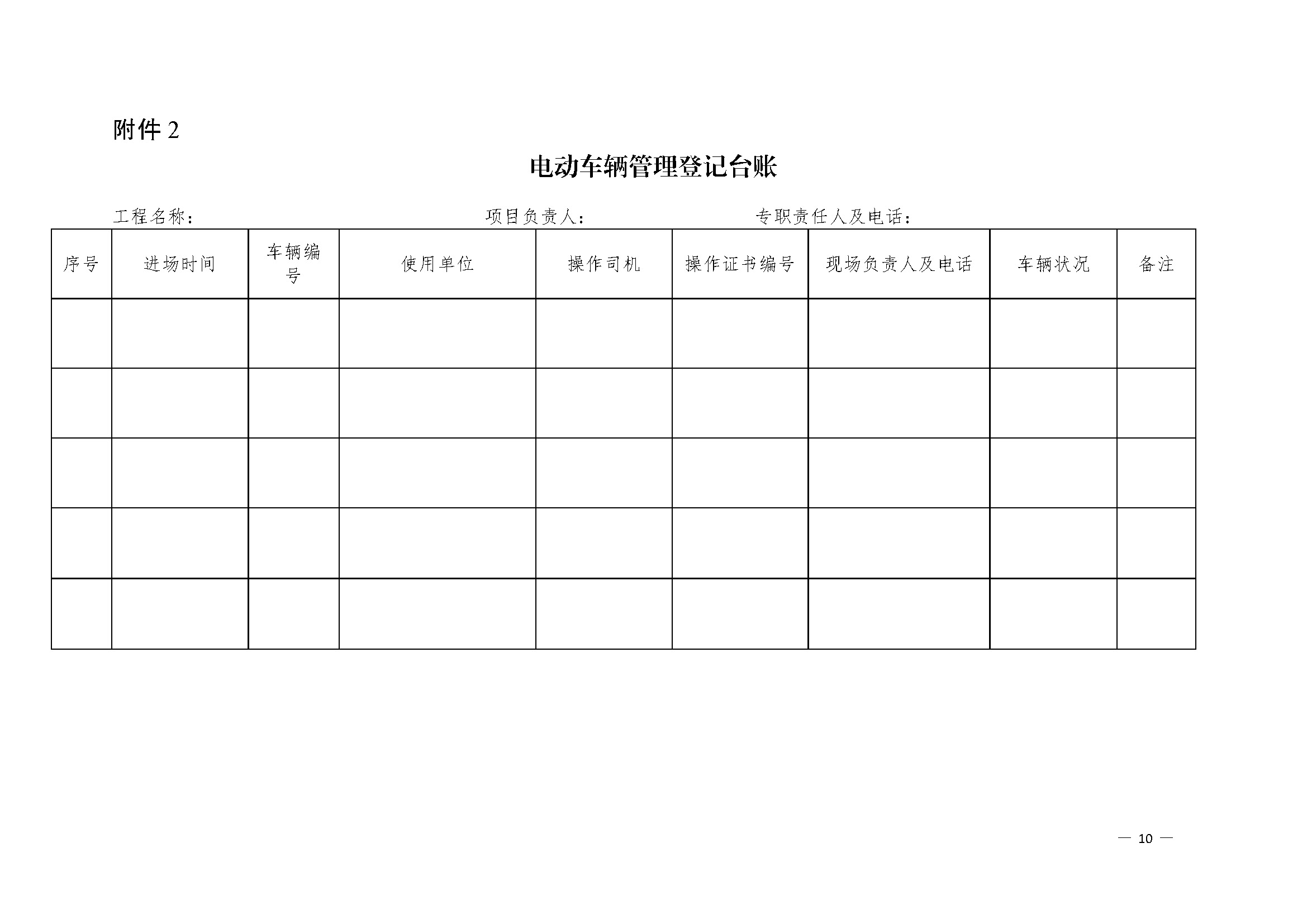 (四)施工總承包單位應(yīng)嚴(yán)格履行電動(dòng)車(chē)輛進(jìn)場(chǎng)登記制度,所有車(chē)輛要逐一登記(附件2),并落實(shí)到具體責(zé)任人。車(chē)輛進(jìn)場(chǎng)后,實(shí)施掛牌使用(附件3),做到定崗、定人、定責(zé)。